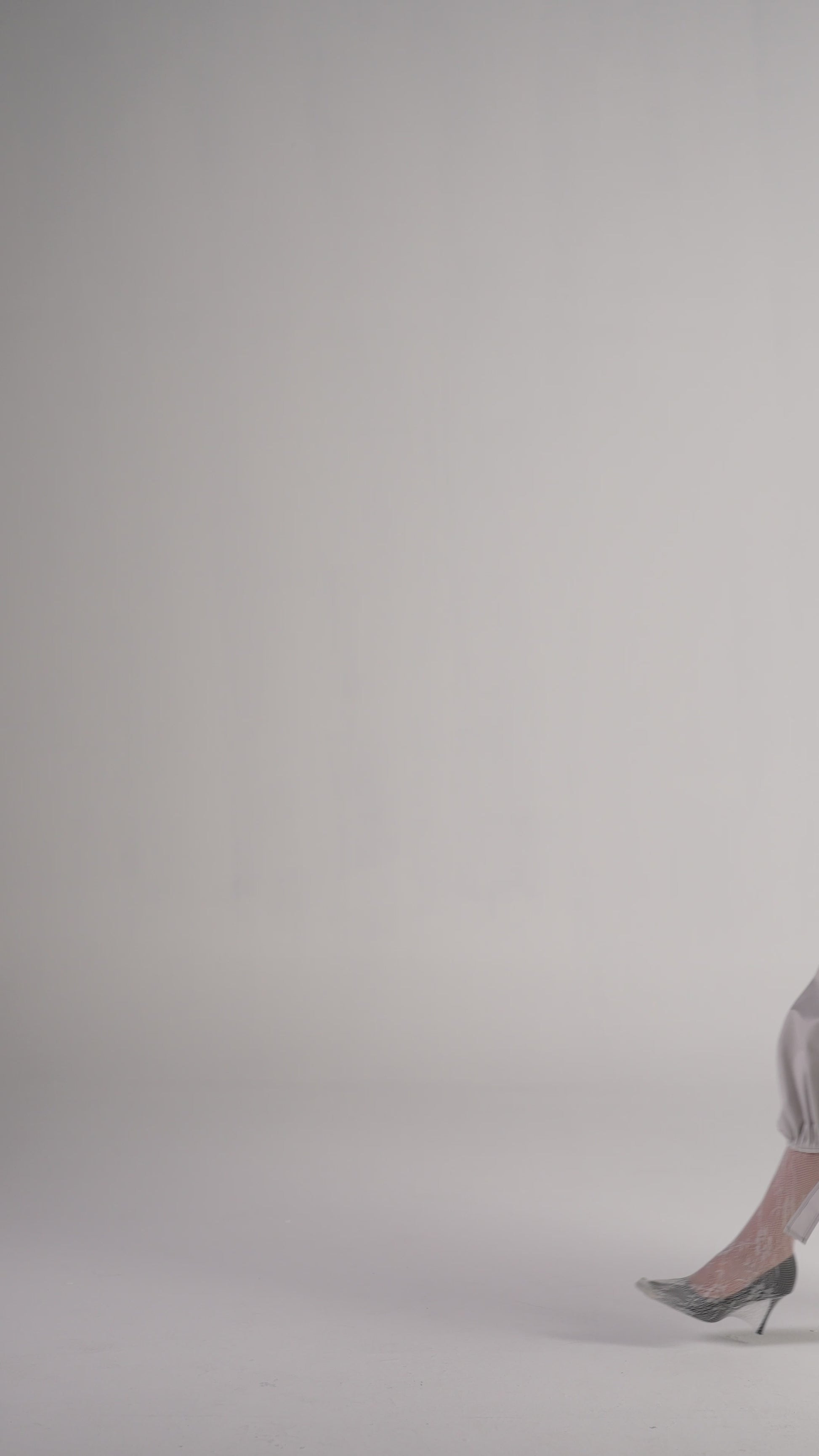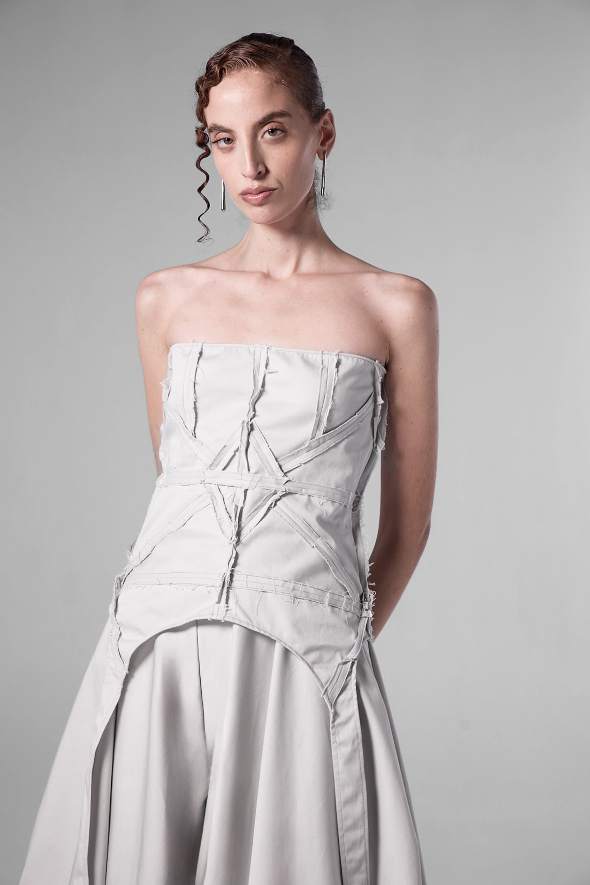 La silhouette est structurée et sculpturale, avec les lignes caractéristiques de porte-jarretelle et des détails géométriques.