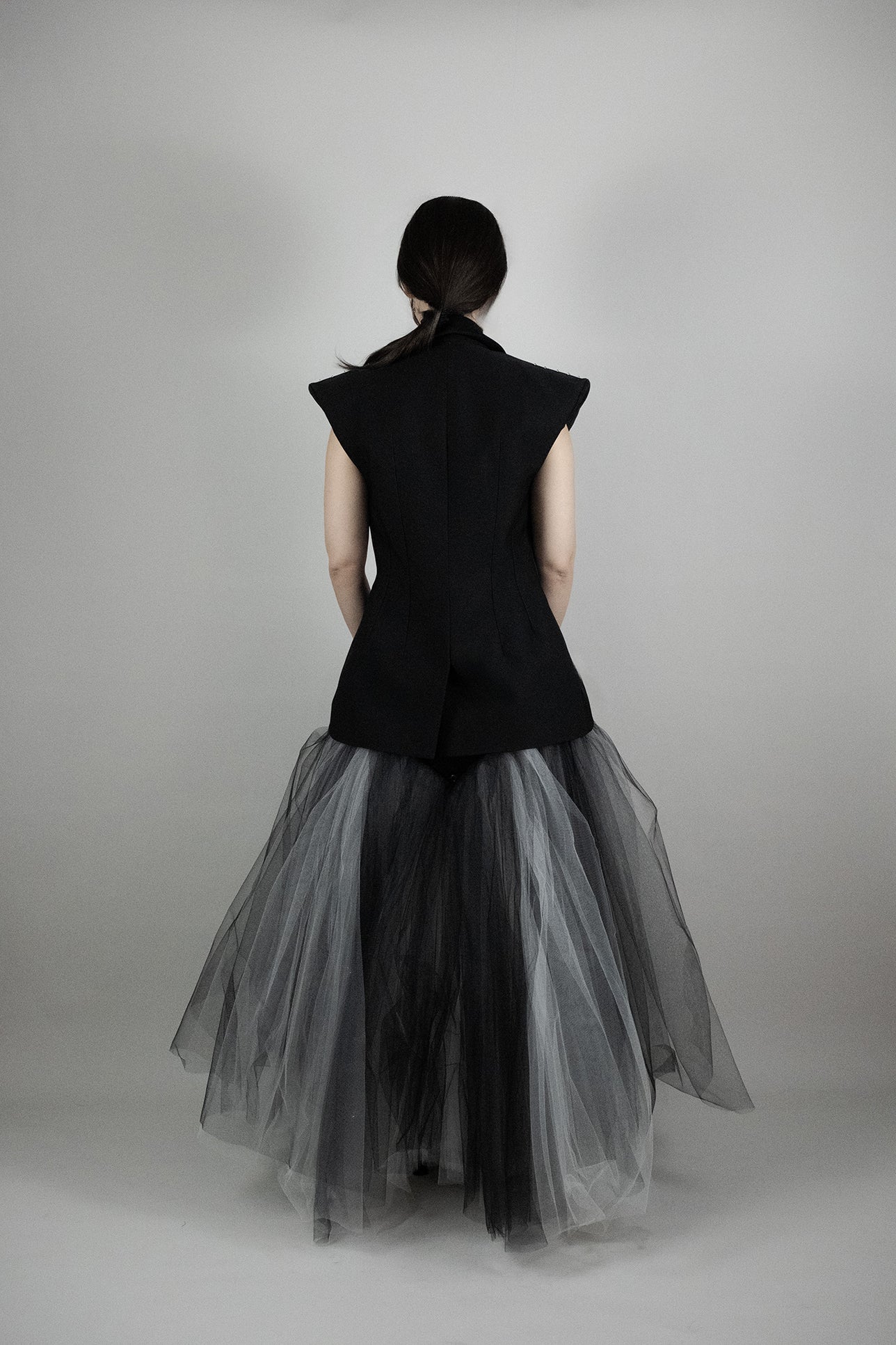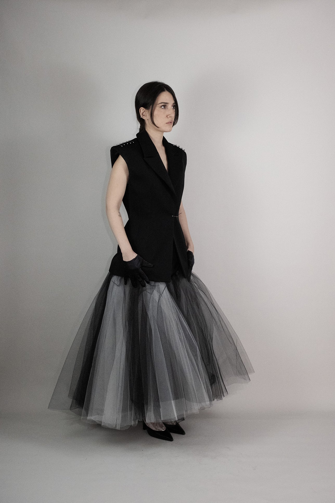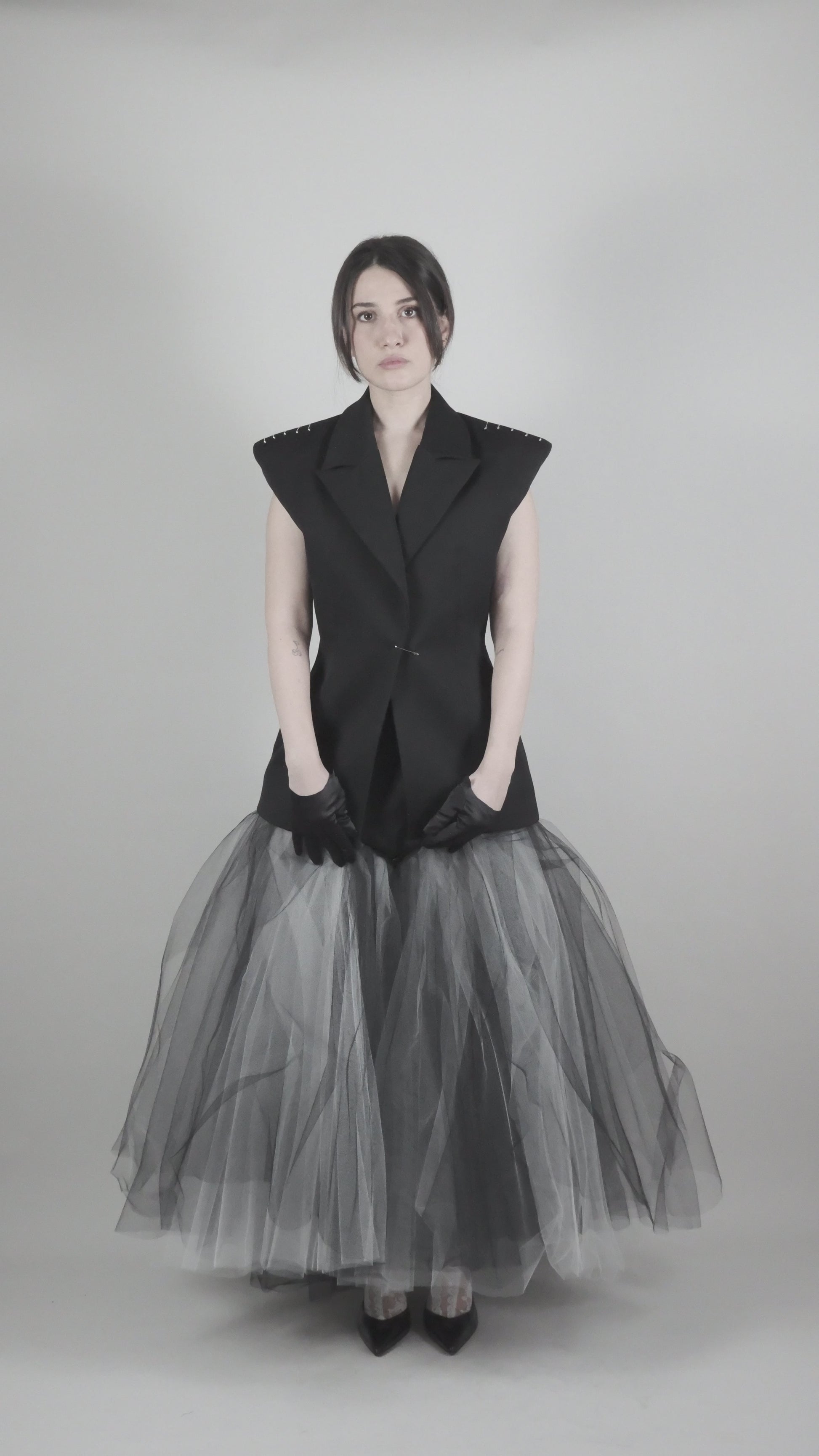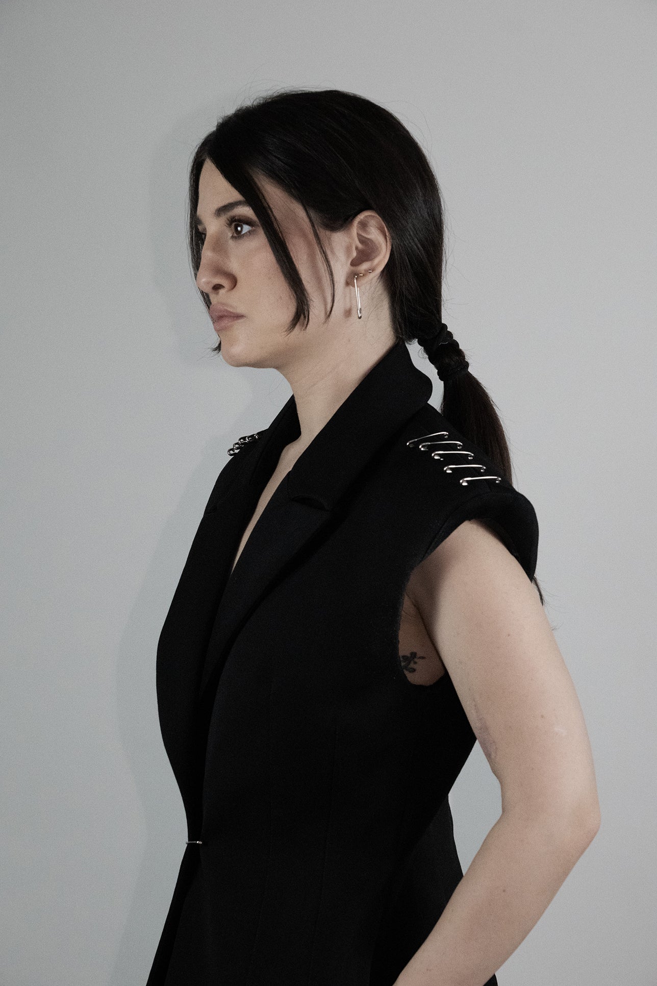100%ウールのデッドストック生地で作られており、オーバーサイズの肩、ウエストにぴったりとしたシルエット、シルバーのピンのディテールが特徴です。
