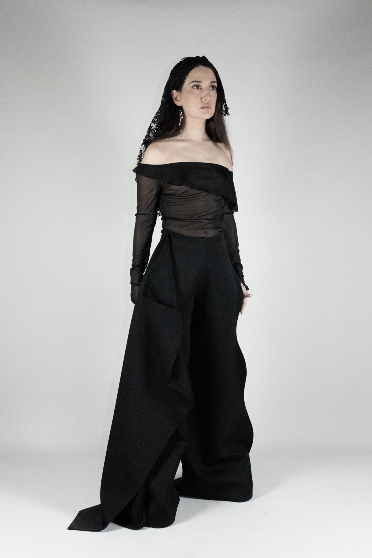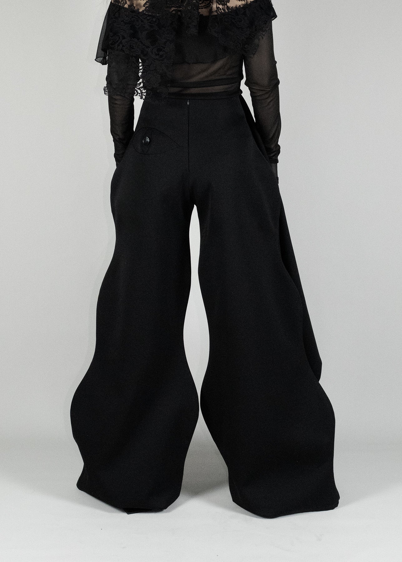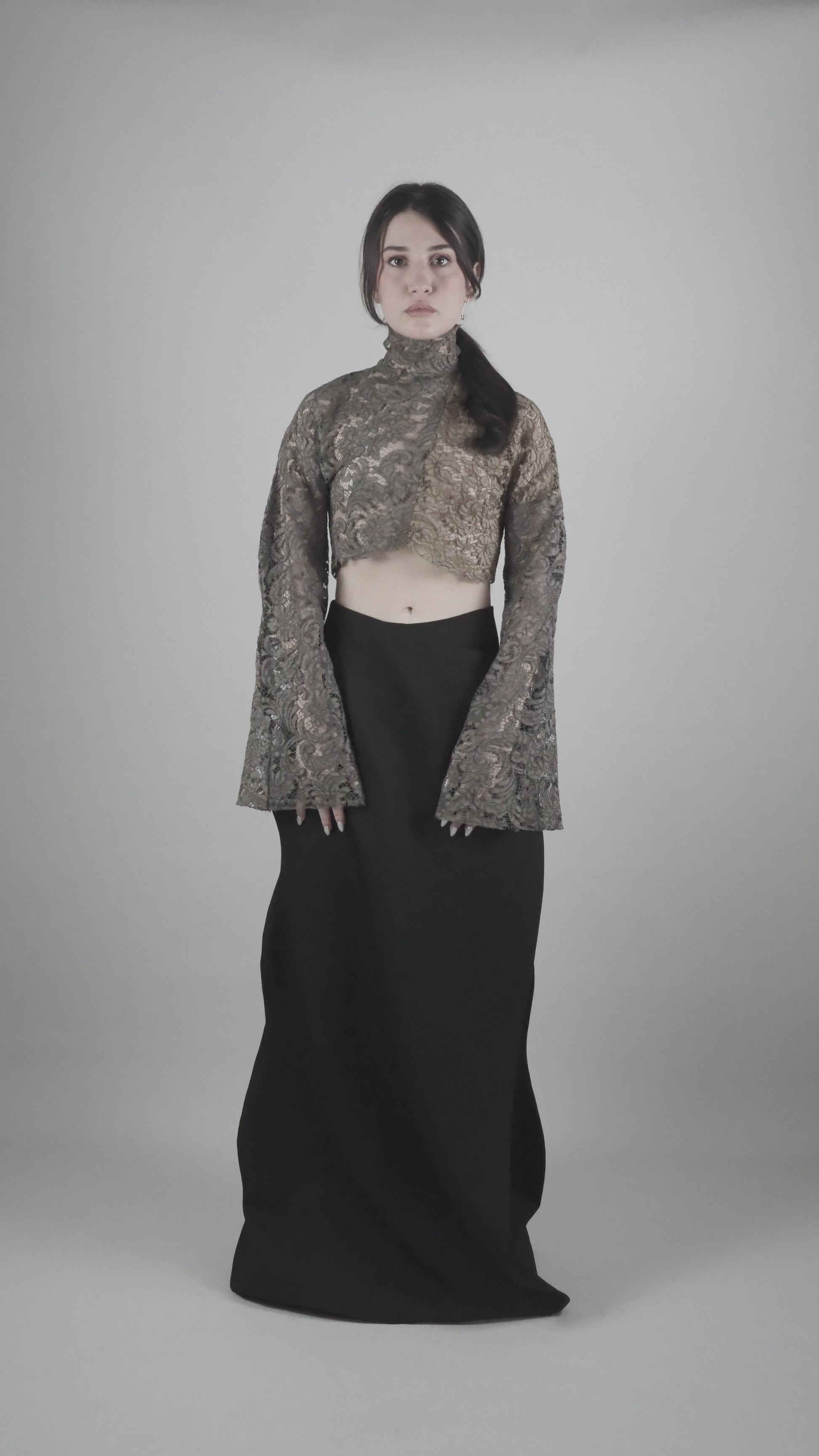 デッドストックのウール100%生地を使用し、オーバーサイズのシルエット、ウエストにフィットするフィット感、そして魅惑的なウェーブ効果で、スタイルと汎用性を兼ね備えています。背面のアイディテールが2通りの着こなしを可能にし、魅力とモダンさをプラスしています。