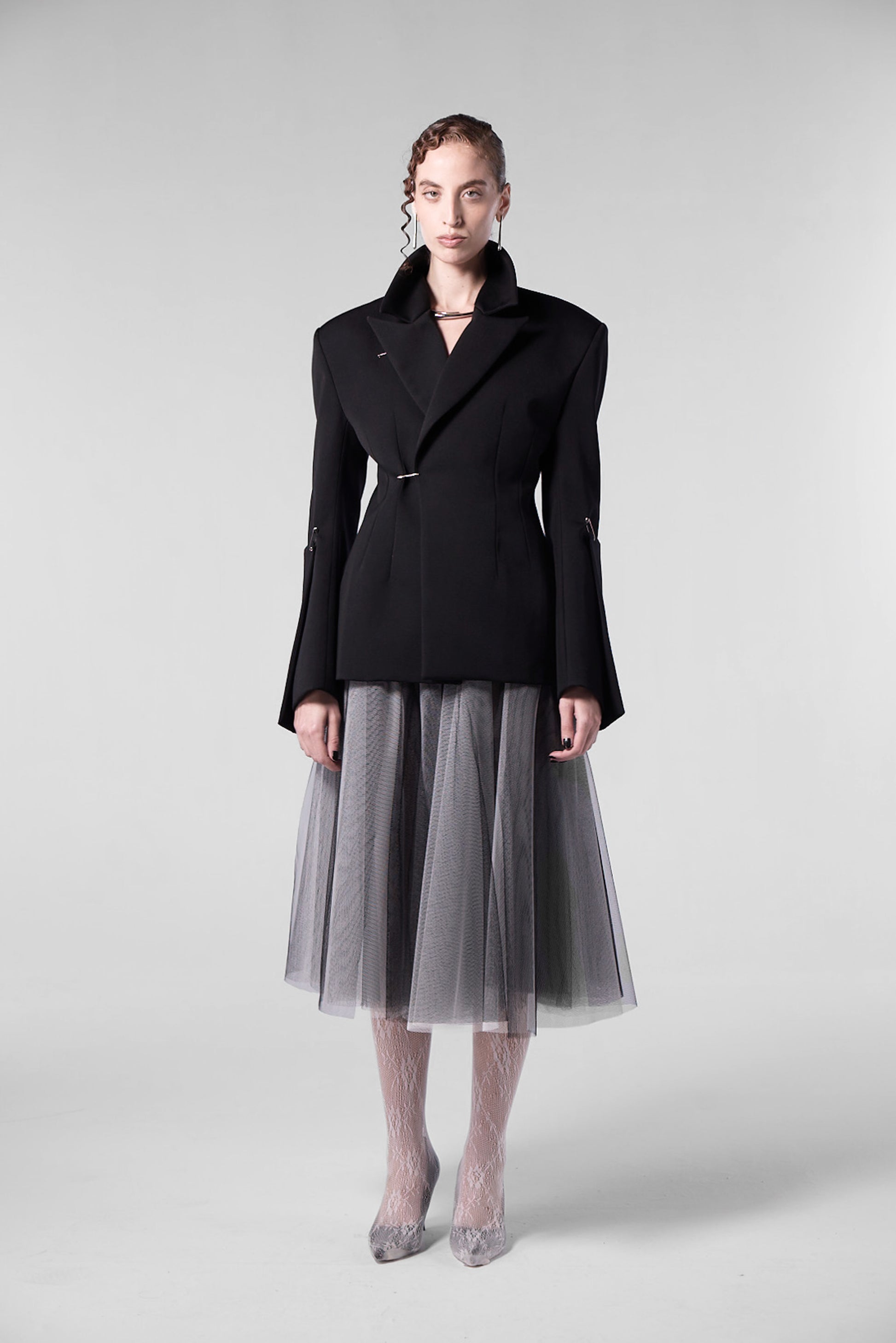The Kimono-Suit Jacket is made from unused deadstock fabric, this timeless piece features oversized shoulders and a waist-hugging silhouette. The attachable kimono sleeves let you easily switch up your look, offering versatility