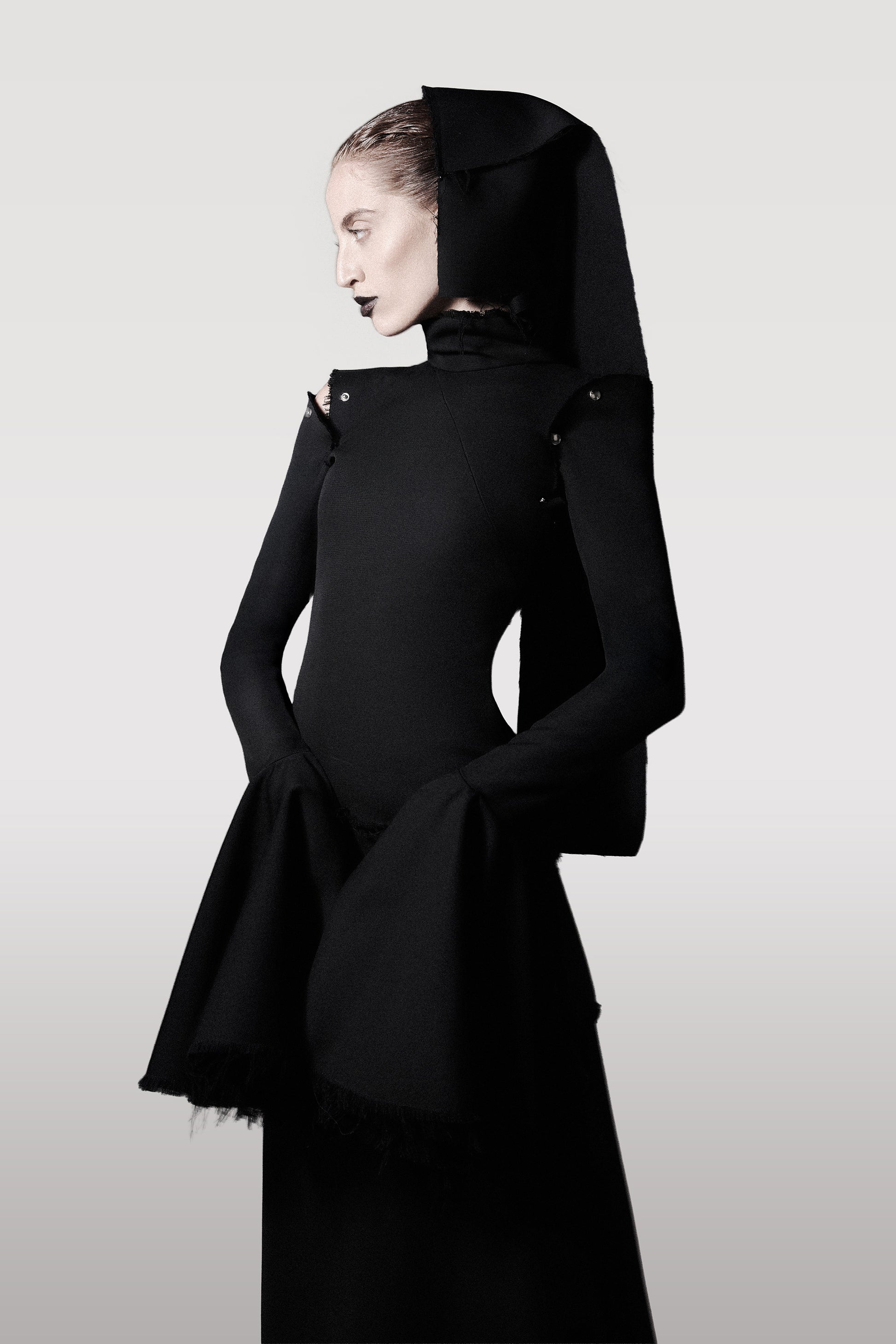 Wool headpiece with a clean, elongated silhouette that frames the head and falls softly down the back